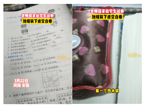 河南安陽的劉老師把沒改完的學(xué)生試卷拿回家批改,一不留神爸爸把暖水袋放試卷上,等她忙完再繼續(xù)批改時發(fā)現(xiàn)有十幾份卷子很多空白,一開始疑惑學(xué)生們?yōu)槭裁床缓煤么鹁恚詈蟛欧磻?yīng)過來是用了可擦筆。